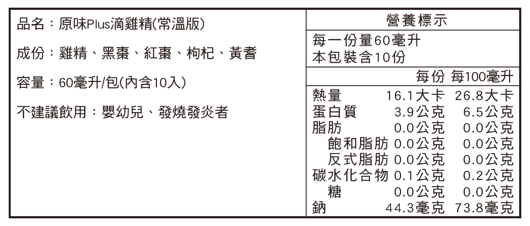 原味Plus滴雞精(常溫):雞精、黑棗、紅棗、枸杞、黃耆